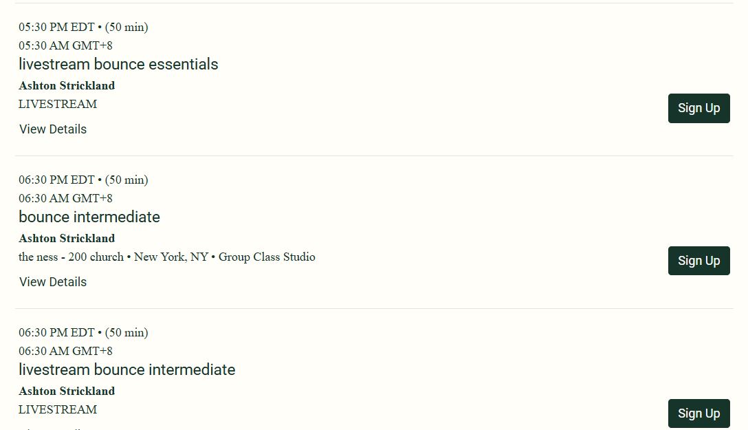 Schedule: In-studio classes are available at their Tribeca location, with varying times. Online classes are also offered through their digital platform. Go to the schedule classes and select your available date. Classes on that date will be provided.