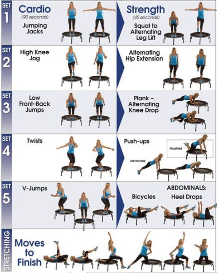 This move mimics jogging in place on the rebounder. You alternate lifting your feet while maintaining a steady bounce. It increases heart rate and builds endurance without the joint impact of running on hard surfaces.